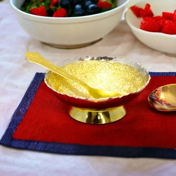 Be the giver of perfect gifts with this two toned german silver bowl and spoon set and earn all the praise you deserve. Add a dash of the royal feeling with this two toned German silver bowl and spoon. This might as well be the eye candy on your dinner table with its minutely carved designs with a hint of elegancy.